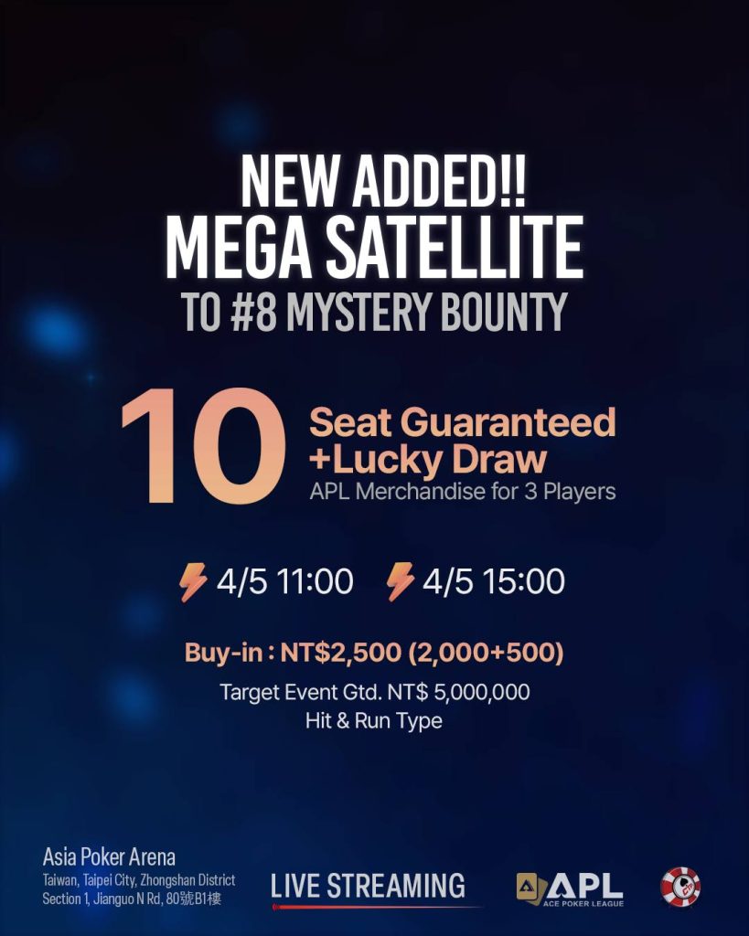 Tomorrow (April 5th), new Mega Satellites for the #8 Mystery Bounty event have been officially added to the schedule! With a massive 10 seats guaranteed and a special lucky draw event prepared, don’t miss your chance to secure a ticket to the NT$ 5,000,000 GTD event!